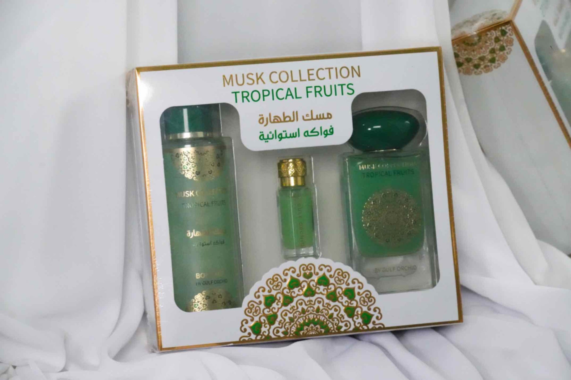 Erlebe die Vielseitigkeit von Moschus mit dem luxuriösen Musk Tropical Fruits Geschenkset von Gulf Orchid Perfumes. Perfekt für Frauen, die sich einen Hauch von Eleganz und Exotik wünschen.