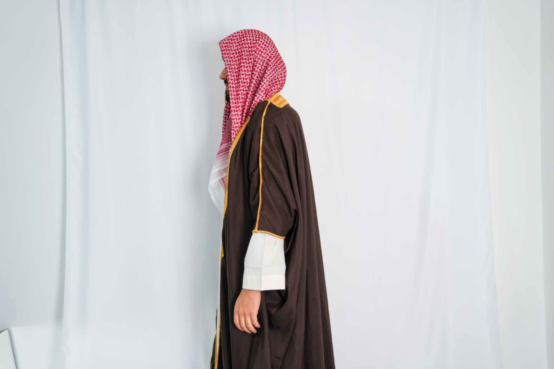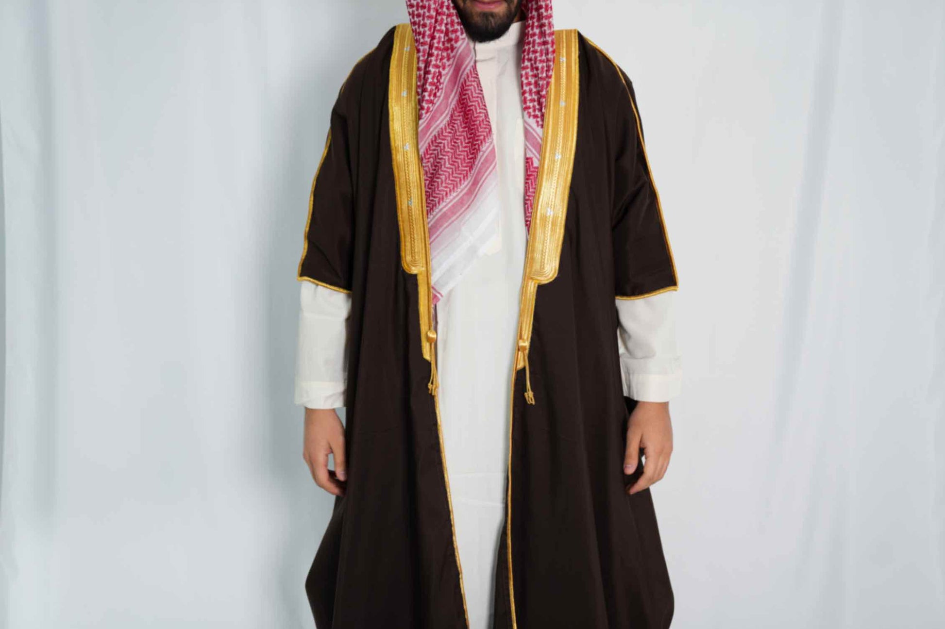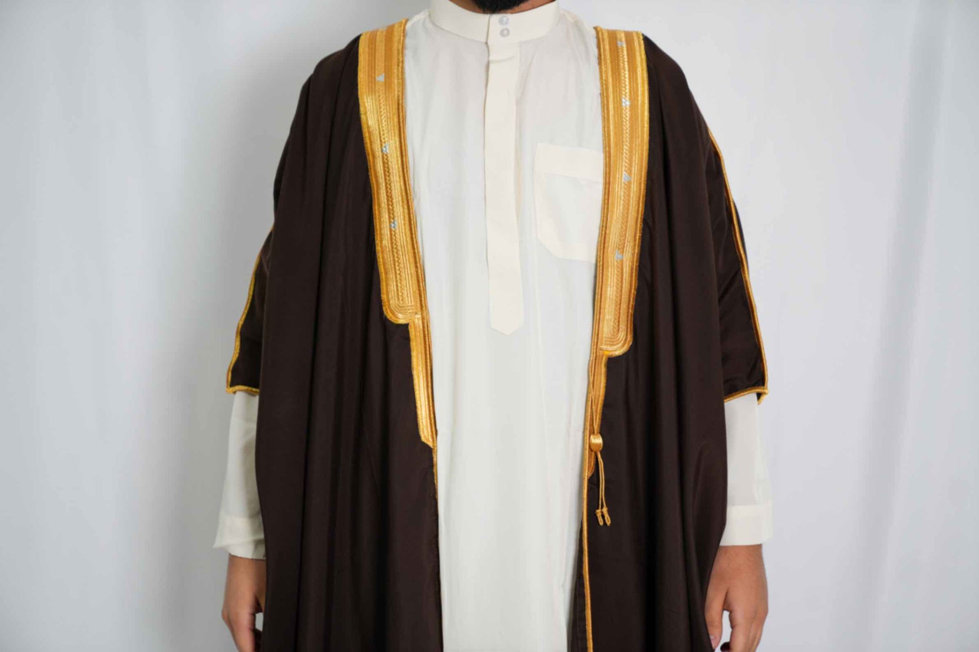 Dieser lange Bisht vereint Tradition und Eleganz in einem stilvollen Design. Perfekt für besondere Anlässe und Partys, setzt er eindrucksvolle Akzente über einem Qamis und verleiht Ihrem Outfit eine edle Note.